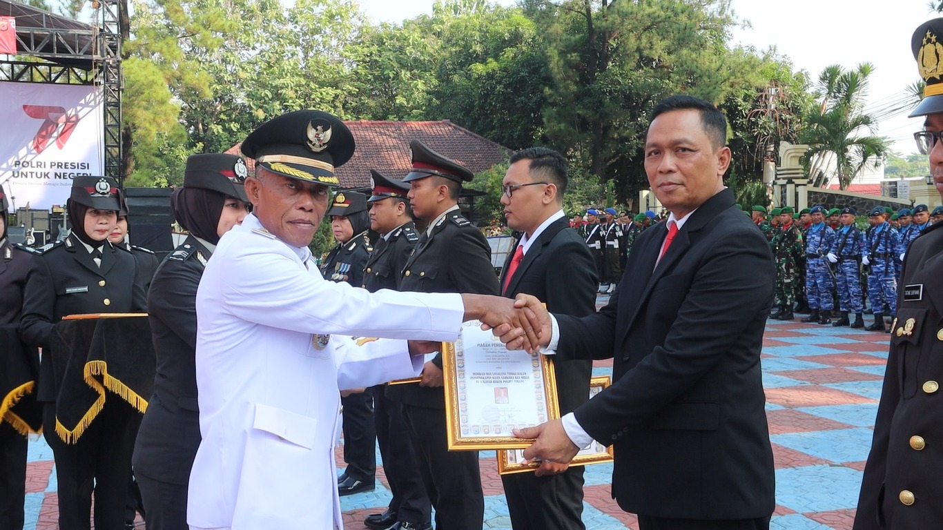 LUGAS BERITA – Kapolres Subang AKBP Sumarni melalui Bupati Subang Ruhimat beri penghargaan kepada Kepala Satuan Reserse Narkoba (Kasat ResNarkoba) AKP Heri Nurcahyo dalam momentum Hari Bhayangkara ke-77 yang digelar di lapangan apel Mapolres Subang, Jawa Barat, Pada Sabtu, 1 Juli 2023.