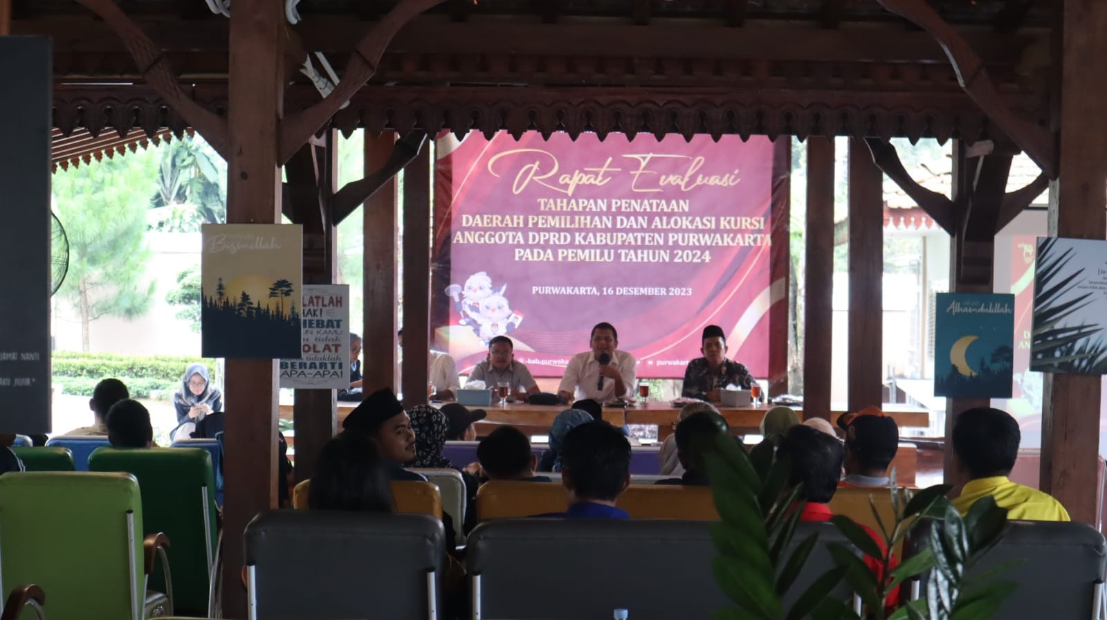 LUGAS BERITA – KPU Kabupaten Purwakarta mengadakan rapat evaluasi Tahapan Penataan Daerah Pemilihan dan Alokasi Kursi Anggota DPRD Kabupaten Purwakarta pada Pemilu Tahun 2024 di Joglo Bojongloa Wanayasa bersama Panitia Pemilihan Kecamatan (PPK) dan perwakilan seluruh Partai Politik Tingkat Kabupaten Purwakarta, Sabtu 16 Desember 2023.
