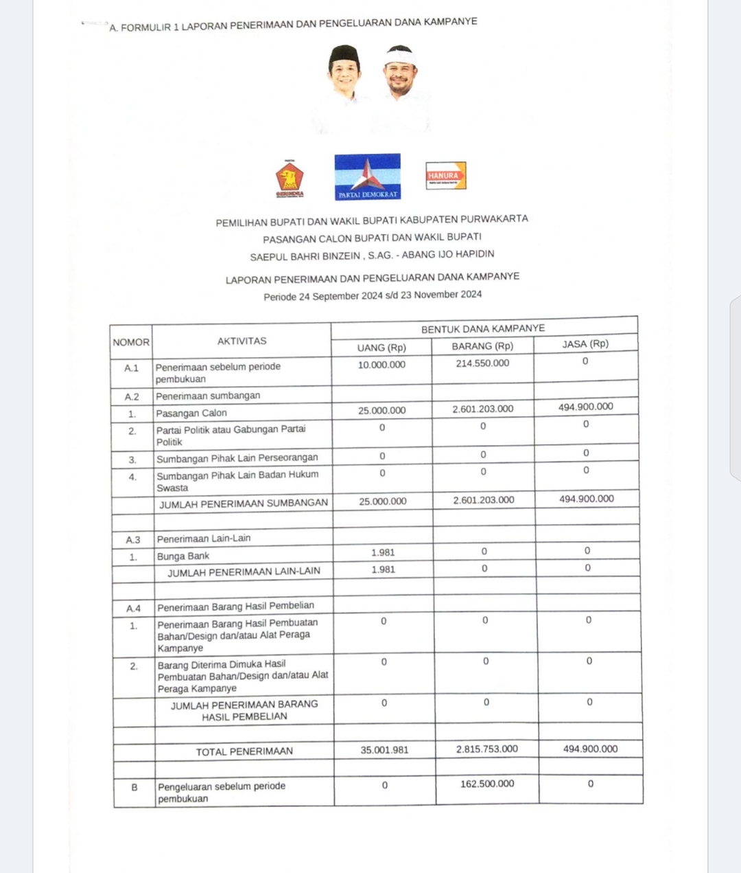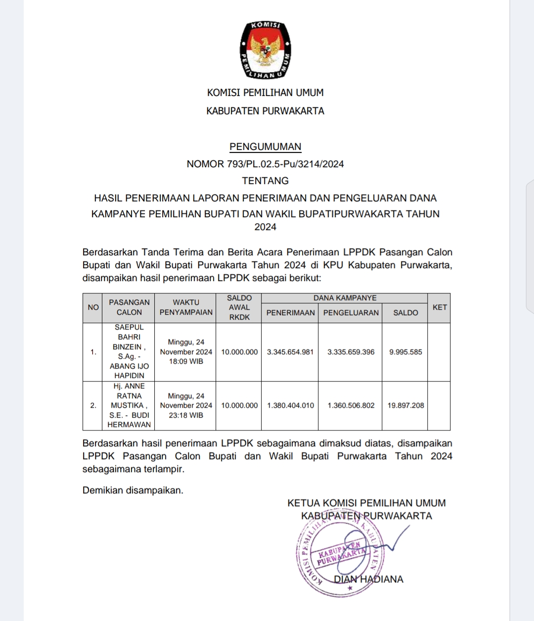 LUGAS BERITA – Berdasarkan Tanda Terima dan Berita Acara Penerimaan LPPDK Pasangan Calon Bupati dan Wakil Bupati Purwakarta Tahun 2024 di KPU Kabupaten Purwakarta, disampaikan hasil penerimaan LPPDK sebagai berikut: