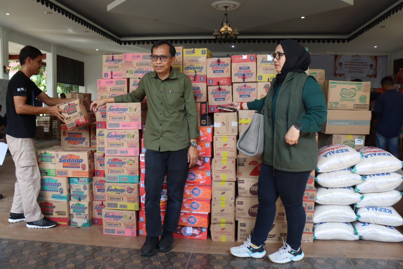 Bantuan terdiri dari berbagai kebutuhan pokok seperti mie instan, beras, susu anak, biskuit, popok bayi, serta air minum dalam kemasan.